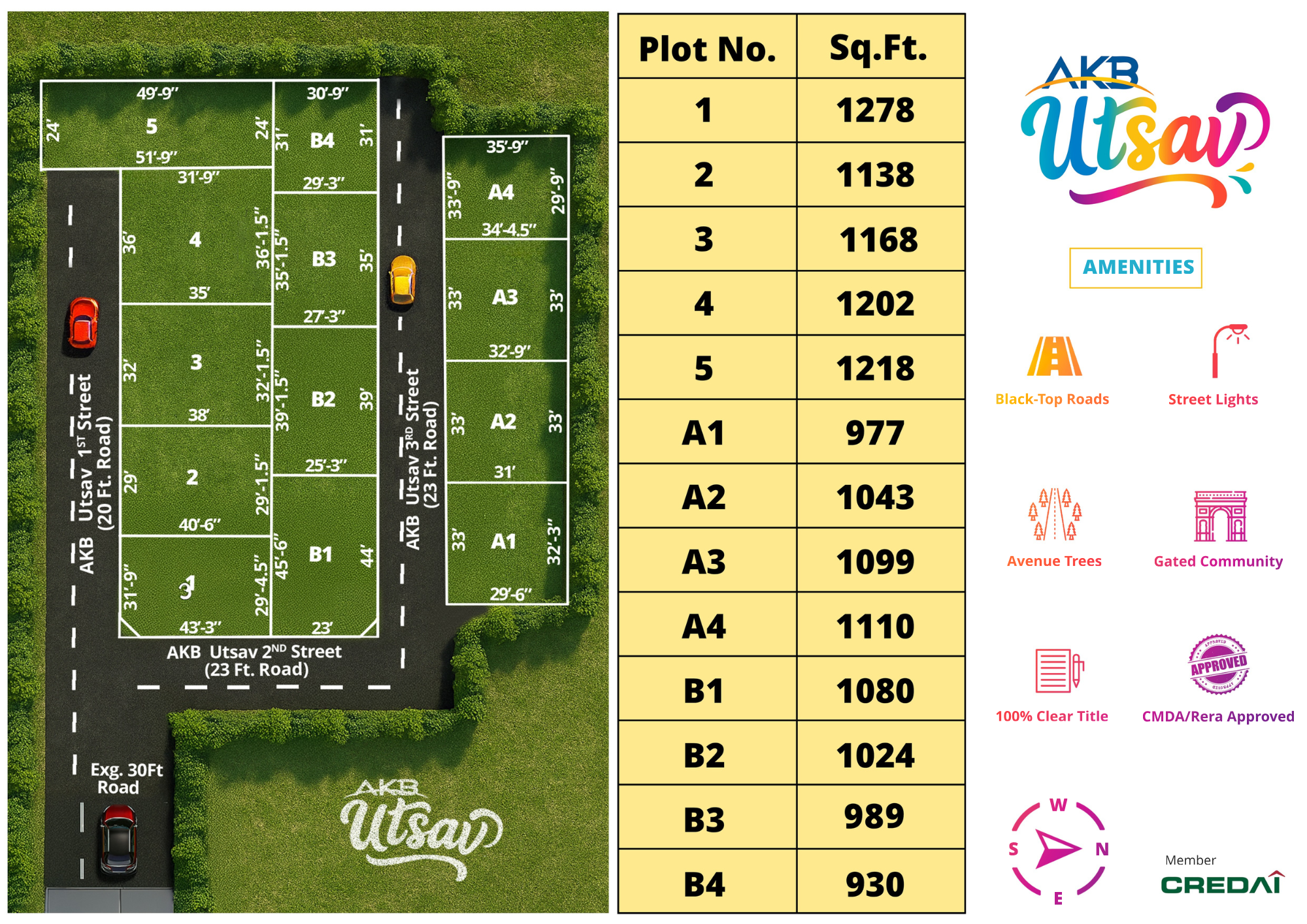 Welcome to AKB's Utsav. A premium residential plotted development project spread across 0.55 acres in Nedugundram, just few minutes from the fastest growing Vandalur–Kelambakkam Road. With 13 well-planned plots in a secure gated community. It is set amidst a fully developed residential neighbourhood. From schools, colleges, hospitals to all other basic requirements of life, this location has got all of it covered. The layout is beautifully designed with wide roads, clear demarcation, and all essential amenities for comfortable living. Its strategic location offers excellent connectivity and high appreciation potential, making it ideal for building from your dream home.
